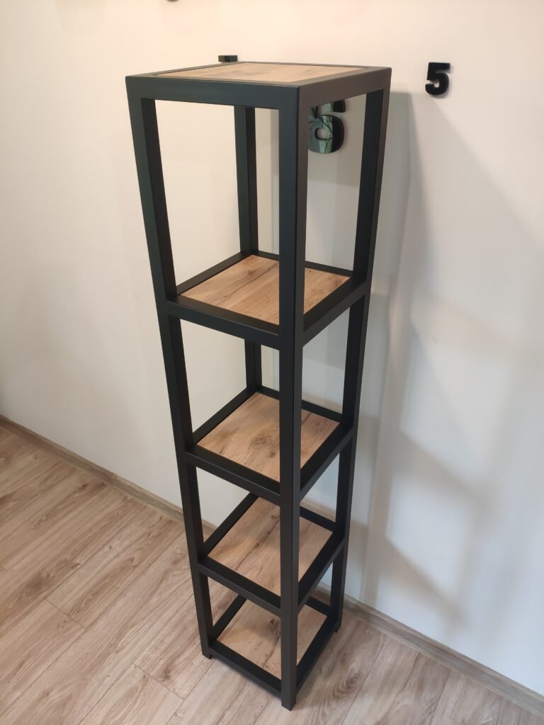 Wysoki, wąski regał na pięciu poziomach to praktyczne i stylowe rozwiązanie do przechowywania lub ekspozycji. Nadaje się zarówno na książki, jak i dekoracje, rośliny czy pudełka. Czarne stalowe ramy i półki w odcieniu dębu tworzą efektowny kontrast, który dopełni każde wnętrze. Stabilna konstrukcja i kompaktowe wymiary sprawiają, że regał doskonale wpasuje się nawet w niewielką przestrzeń.